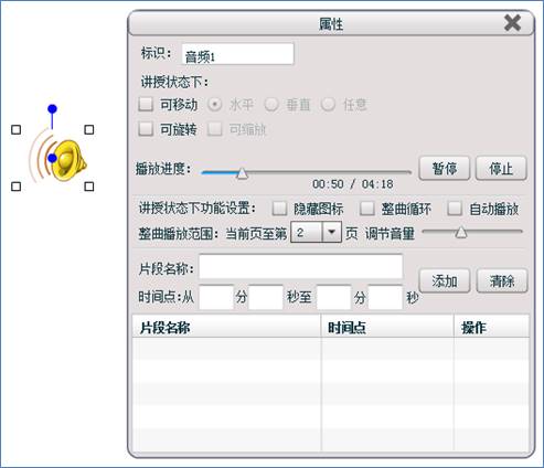 当讲授页面中有音频对象时,可以双击音频文件切换播放或暂停,点击旁边片段按钮自动播放对应按钮名字的音频片段,双击音频对象停止。