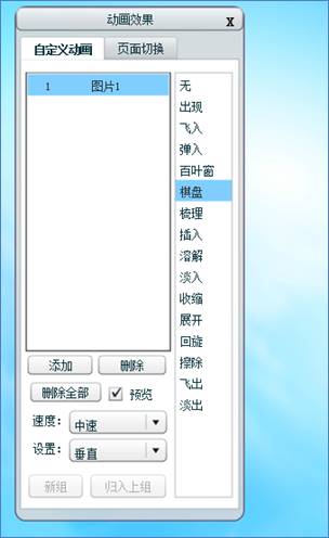 自定义动画部分包括出现、飞入、弹入、百叶窗等动画效果,当选中其中一种动画效果时,会预览选中的效果,点击添加,选中的对象的标识会自动编号添加到对话框左侧的列表中,该编号表示组别,即同一组的对象同时、同种动画效果出现;切换一种动画效果时,可以预览到选中的对象应用此动画效果出现。