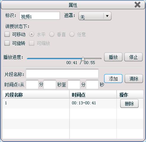 “视频工具”支持插入视频,通过“属性”设置功能,还控制视频播放的进度和设置视频片段播放。方便您在授课文件中引用目前网络上最常见的.flv视频,丰富您的课堂内容。