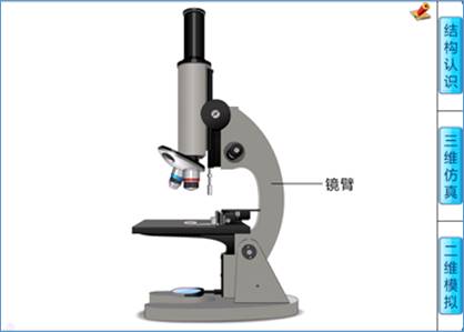 在此模块中,可对显微镜的结构进行讲解,鼠标滑过会有对应部位名称出现,并配有练习模块,可对填写内容进行判断并给出正确答案,当鼠标点击某个具体的空后点击答案出现的是该部位的名称,当鼠标点击空白处后再点击答案则给出的是全部名称。