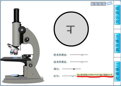 在此模块中,可按照真实的操作规则对显微镜进行调试,反光镜、转换器、粗准焦螺旋、细准焦螺旋、载物台等都可进行操作。