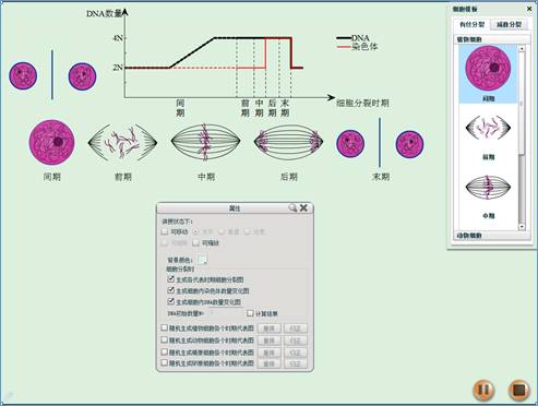 展示有丝分裂、减数分裂各个时期细胞分裂的过程以及各个过程中DNA和染色体变化的曲线,可以进行不同细胞之间各个时期的比较。分为植物有丝分裂、动物有丝分裂、精原细胞减数分裂、卵原细胞减数分裂,可以展现各个细胞在各个时期的动画效果。同时生成DNA 和染色体变化的曲线。