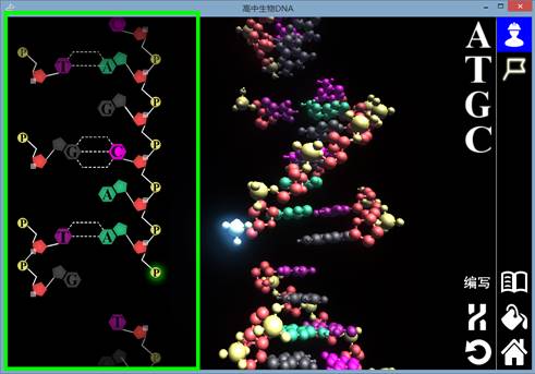 在【DNA】结构学习模块,选择要拼接的DNA双螺旋的初始状态,可以手动编写,也可以由系统生成。在操作画面中,左侧为二维展示区,上下拖拽此区域可以移动DNA长链。右侧为DNA双螺旋球棍模型,可以缩放、旋转观察,点击球棍模型的某一基团,可以看到左侧与之对应的结构。