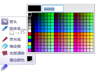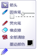 在文件编辑或播放状态下,都可使用此功能。单击内容显示区左下角的铅笔图标,即可出现屏幕书写工具菜单,包括箭头工具、圆珠笔、荧光笔、橡皮擦、全部清除和墨迹颜色六个功能选项。