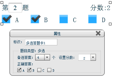 在属性框中可以设置正确选项、备选答案个数、设置这道题的分数,选中答题卡,拖拽可以调整显示位置,答题卡上的四个白色控制点可以更改答题卡大小。