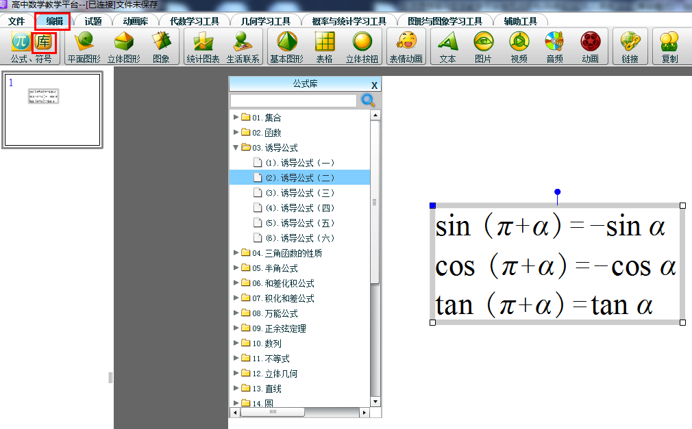 单击“公式库”按钮,出现如下图所示的公式库列表,点击分类名称对应标签,即可看到此分类下的公式,并且可以对公式进行再次编辑和修改。