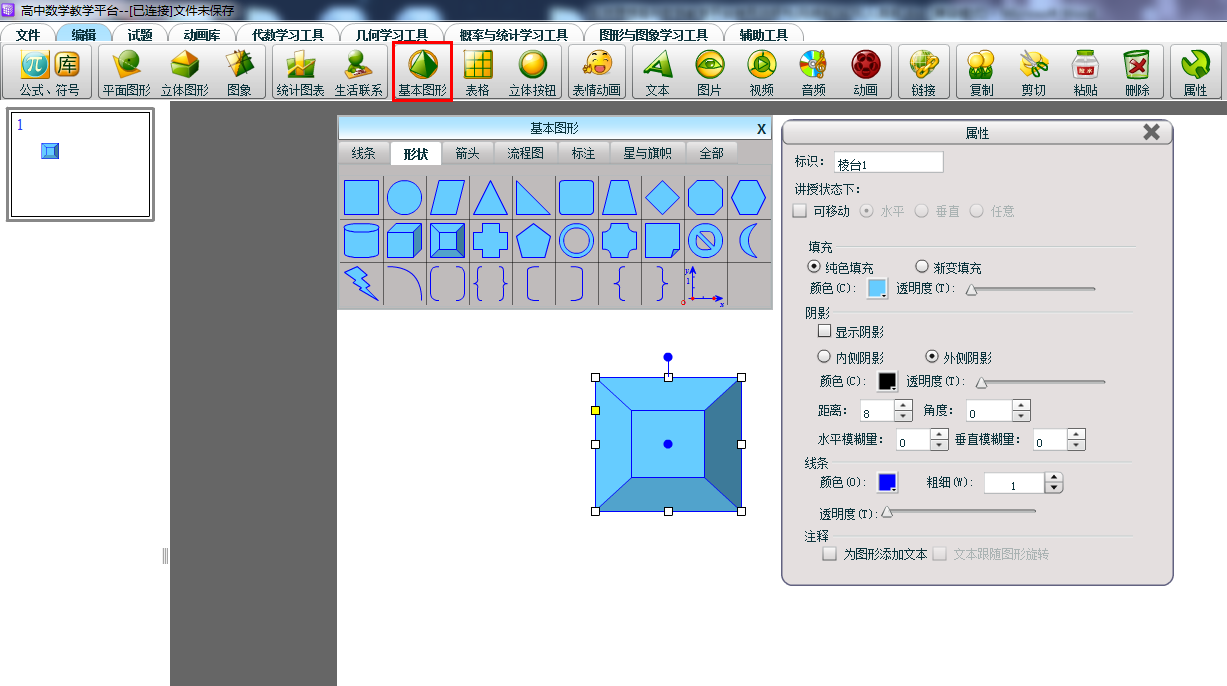 单击“图形”按钮,出现“基本图形”菜单。单击菜单中的图形,然后在页面上进行左键拖拽操作,即可画出对应的图形。