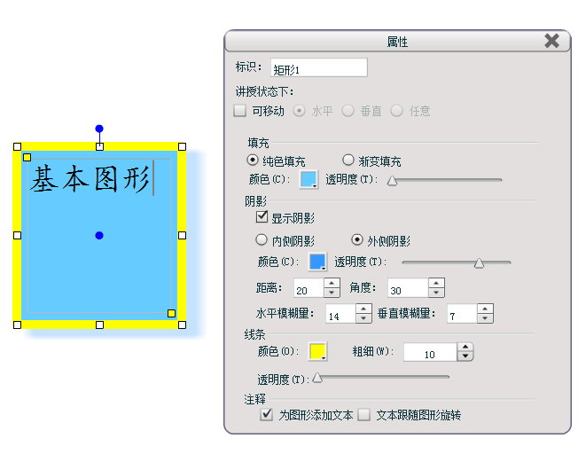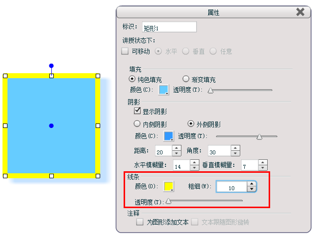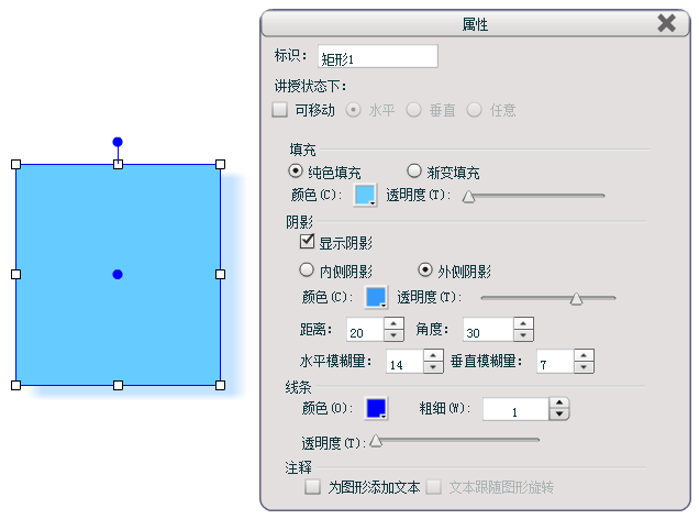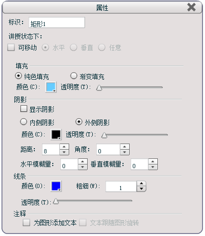 通过“属性”设置功能,还可以改变图形的填充颜色和透明度、阴影的位置和颜色以及距离、线条颜色和粗细一级透明度、箭头样式及注释是否为图形添加文本、文本是否跟随图形旋转(注:只有勾选“为图形添加文本”后,同时选中图形,才能进行“文本跟随图形旋转”的设置)。