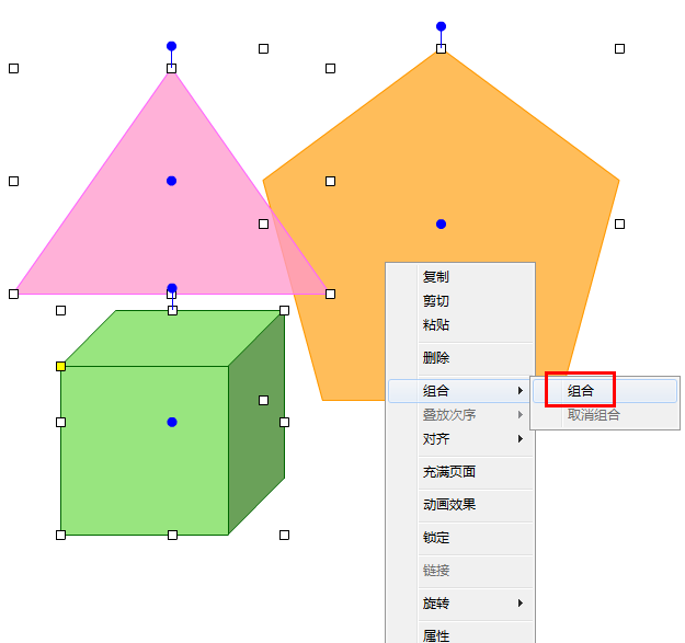 按住Shift同时选中几个图形,在选中对象上右键单击,调出右键菜单,鼠标移动到“组合”文字上,即出现分菜单,左键单击分菜单中的组合功能,可以将选中的图形组合成一个整体。