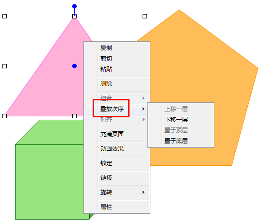 选中要编辑的图形后,右键单击图形,调出右键菜单后,鼠标移动到“叠放次序”文字上,即出现分菜单,可以选择将选中图片“上移一层”、“下移一层”、“置于顶层”或“置于底层”。