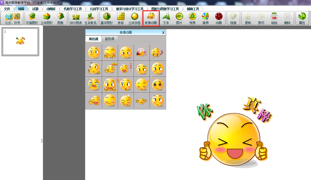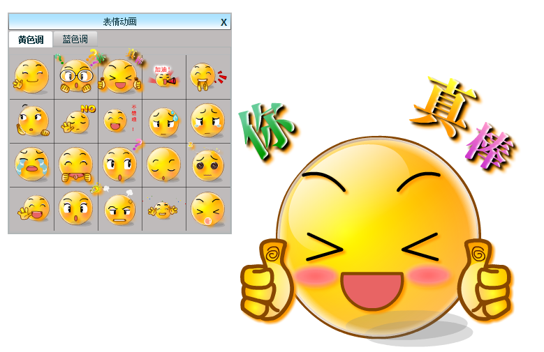 点击“表情动画”按钮,弹出黄色调和蓝色调两种色调的表情动画缩略图表,单击缩略图,添加表情动画。