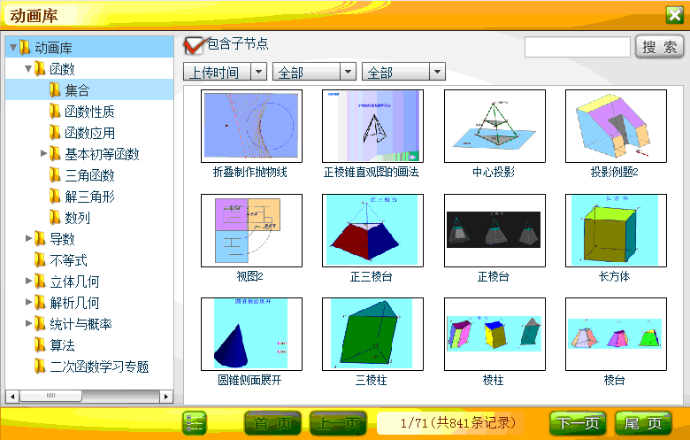 该模块包含高中数学教学中涉及到的相关动画。单击“动画库”选项标签,即可看到其功能菜单。