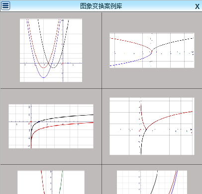 《图象变换》软件主要用来对一次函数、二次函数、反比例函数、幂函数、指数函数、对数函数的图象进行平移、翻转、伸缩、对称等变换,让学生对常用的函数图象的变换有直观的印象,能够理解改变解析式对图象位置、形状的影响。