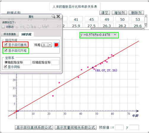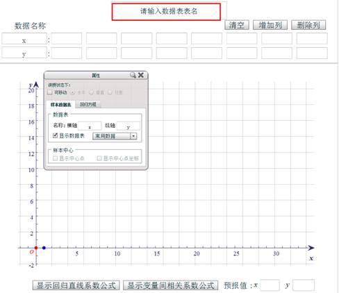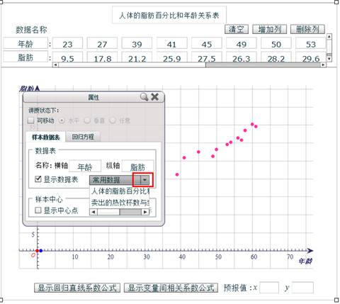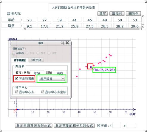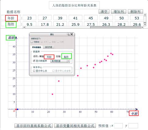 辅助教师讲解和学生学习变量间的相关关系。利用计算机的优势准确绘制散点图,让学生发现变量间的关系、总结回归函数的获得过程。