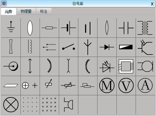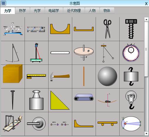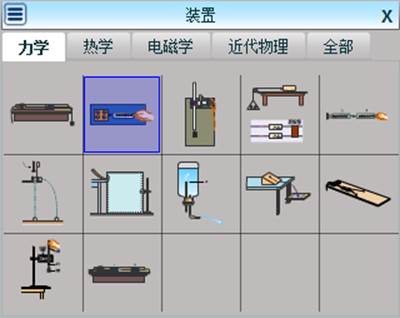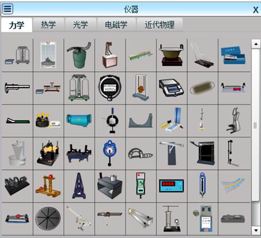 ,出现如下图所示的仪器图形选框,点击分类名称对应标签,即可看到此分类下的各种实验仪器的缩略图。