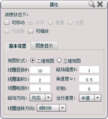 可以设定线圈匝数,磁场强度,旋转方向及快慢等物理量。
