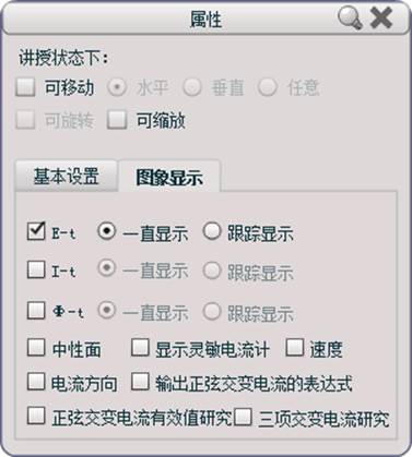 可以显示电流时间,电动势时间等图像。并且可以选择观察正弦交流电有效值研究动画等。