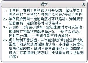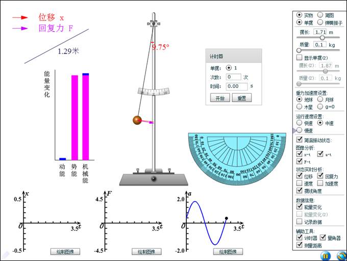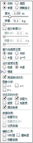 可选择显示相应的能量变化条、数据记录表格、周期计算窗口、量角器和测量工具等。