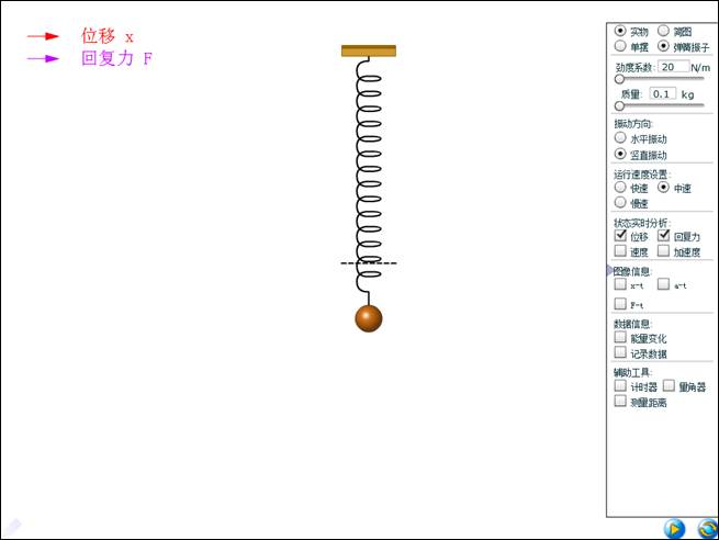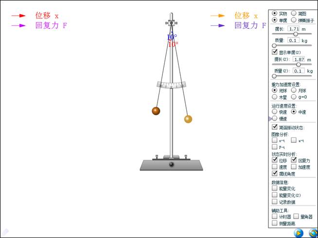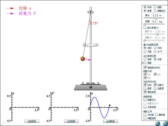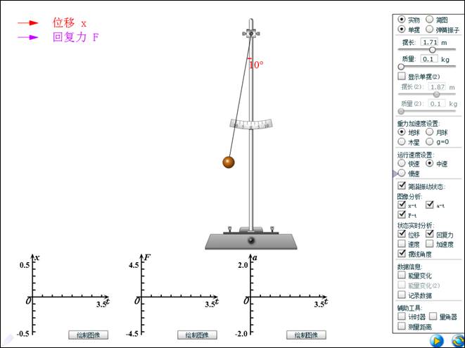 机械振动探究环境构建工具提供单摆和弹簧振子模型,可设置属性;能够按照简谐振动规律动态模拟所选择单摆或弹簧振子的简谐振动过程;动态调整所选择对象属性时,简谐振动的过程能够按照简谐振动规律发生相应变化;能够显示运动对象的回复力、速度、加速度的大小和方向;能够显示运动对象的位移时间图像、加速度时间图像、受力时间图像。
