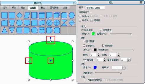 通过“属性”设置功能,还可以改变图形的填充颜色和透明度、阴影的位置和颜色以及距离、线条颜色和粗细以及透明度、箭头样式及注释是否为图形添加文本、文本是否跟随图形旋转(注:只有勾选“为图形添加文本”后,同时选中图形,才能进行“文本跟随图形旋转”的设置)