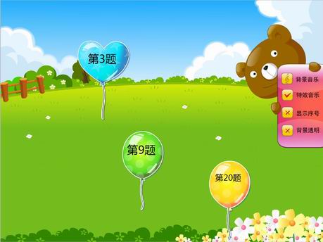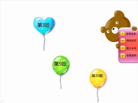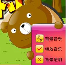(2)通过设置面板可进行“背景音乐”、“特效音乐”、“背景透明”等设置;点击小熊面板隐藏;点击右侧小手,面板弹出。