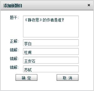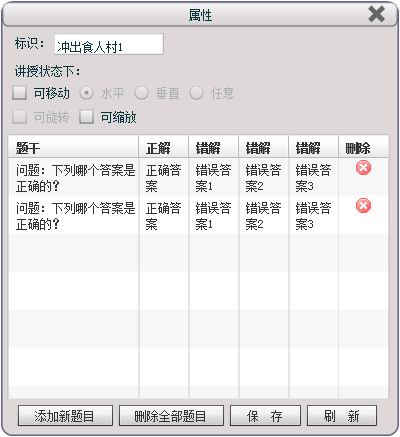 (4)在属性中可以添加、删除或保存题目,制作自己想要的练习内容。比如,点击“添加新题目”,按要求填入相应内容,点击“确定”,该题进入游戏模板,如下图: