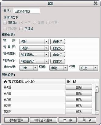 (5)在属性中可以添加、删除或保存题目,制作自己想要的练习动画。比如,点击“添加新题目”,在输入框中输入内容后,点击“确定”,该题进入游戏模板,如下图: