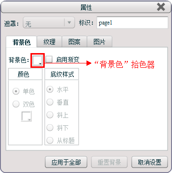 ⑤单击『重置背景』按钮,将当前页背景恢复为本次编辑前的统一背景。(注:只有改变某一页面背景后,该页面属性中的『重置背景』按钮才可用。)