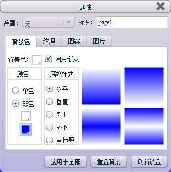 在页面属性对话框中,选中『背景色』选项标签,可添加单一背景色,也可以添加渐变背景色。