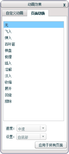 页面切换的动画效果包括飞入、弹入、百叶窗等12种动画效果,当选中其中一种动画效果时,可以预览到当前页面应用此动画切换的效果。