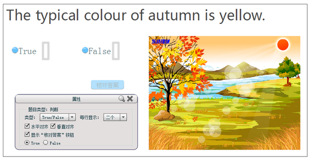3.属性设置:在属性框中可设置备选答案的类型、每行显示的个数、是否水平或垂直对齐、正确答案和是否显示『核对答案』按钮。若设置显示『核对答案』按钮,在讲授状态下答题后,可判断对错,并显示正确答案(“对号”表示正确答案)。(注:在讲授状态下答题时,只有选中某一选项后,才可以点击『核对答案』按钮判断答案正误。)
