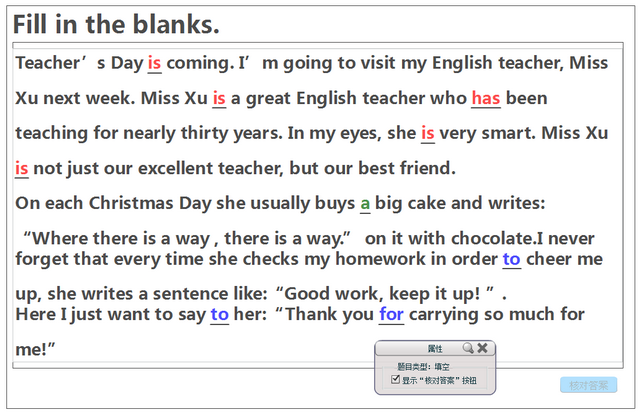 3.属性设置:在属性框中可设置是否显示『核对答案』按钮。如果设置显示『核对答案』按钮,在讲授状态下答题后,可点击该按钮判断对错。