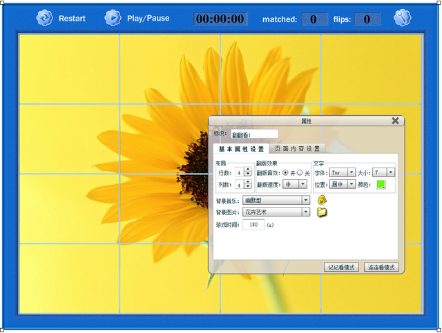 布局、翻版效果、文字,背景音乐,背景图片。游戏时间等进行设置。 这些基本设置,除了行列数是需要根据训练的内容进行调整,其余的可以默认系统的设置。