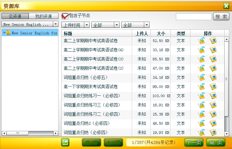 在登录状态下,可查看资源库中的资源。根据用户的需要,可随时切换成云版资源库中的公用资源和本人上传的私有资源,即“云资源”和“我的资源”。单击“New Senior English for China(必修)”右侧的下拉箭头,可进行教材版本的切换;可点击左侧小三角