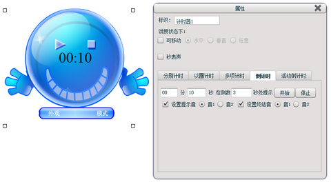 下面以『蓝色精灵』模板为例,来介绍计时器的使用方法。计时器上的功能按钮分别可以控制计时器的开始、清零和记录结果。将鼠标移到计时器上,单击鼠标右键,选择『右键菜单』中的『属性』,即弹出属性对话框,在属性对话框上可以对不同计时方法进行详细的功能设置。