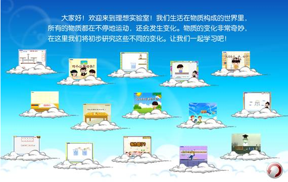 物质世界知识主题,以理想实验室为实验园地,呈现生活在物质构成的世界里物质的不同变化过程。单击每个实验的缩略图,呈现对应的实验内容,进而完成实验的操作。地球与宇宙知识领域对应的理想科技馆具有同样的格式布局和操作方式。