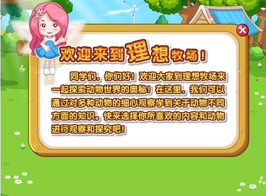对于生命世界的主题内容,鼠标滑过牧场或农场,即可进入相应的理想牧场和理想实验田实验园地,以牧场为例。鼠标滑过牧场,点击选中牧场,进入理想牧场,具体如图: