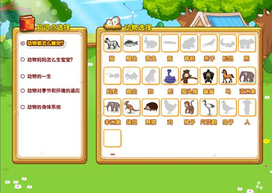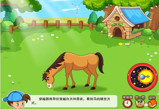 进入理想牧场后,呈现的是牧场的欢迎词,点击弹出窗口右上方的关闭按钮,弹出理想牧场内有关动物的知识点选择和对应的动物界面。选择左侧的“知识选择”下方的知识点,画面右侧呈现选中知识点对应的动物(动物图标变亮,表示此种状态下动物已经被激活,处于可选择状态),点击某个被激活的小动物,即可呈现某个知识内容对应下的动物的状态和特征。选择某个知识点下的某个小动物后,进入对应知识点的动物界面,可以根据界面内的操作按钮提示进行相应的操作,每个按钮均有文字提示,方便大家进行自主学习,以“动物都怎么睡觉”知识点为例,选择“动物都怎么睡觉”知识点,对应的右侧出现提供的常见的几种动物的睡觉方式,选择动物“马”,便可呈现“马”的睡觉方式,具体如下图: