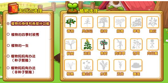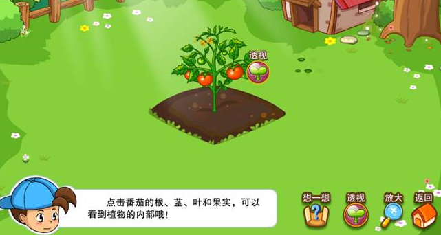 农场的页面布局和操作方式同牧场异曲同工,进入理想实验田后,呈现的是农场的欢迎词,点击弹出窗口右上方的关闭按钮,弹出理想实验田的有关植物的知识点选择和对应的植物界面。选择左侧的“知识选择”下方的知识点,画面右侧呈现选中知识点对应的植物(植物图标变亮,表示此种状态下植物已经被激活,处于可选择状态),选择某个知识点下的某个植物后,进入对应知识点的植物界面,呈现某个知识内容对应下的植物的状态,操作者可以根据界面内的操作按钮提示进行相应的操作,每个按钮均有文字提示,方便大家进行自主学习和探究。以“植物的身体和各部分功能”知识点为例,选择“植物的身体和各部分功能”知识点,对应的右侧出现提供的常见的植物,选择动物“番茄”,便可呈现“番茄”的植物的身体和各部分功能生,具体如下图: