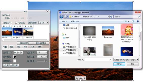 点击“相册制作”按钮QQ截图20131113165100,可以很方便地创设声形并茂的情境,能够很好地满足情境化教学的需求。操作步骤如下: