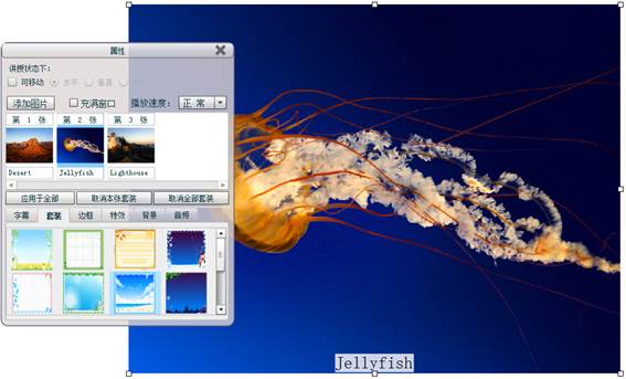 选中图片,激活下方的图片及音频相关设置;图片设置提供了图片的字幕、套装、边框、特效和背景的设置;每种设置都为用户提供了“应用于全部”,“取消本张……”和“取消全部……”以方便用户对单一图片及所有图片的设置。