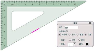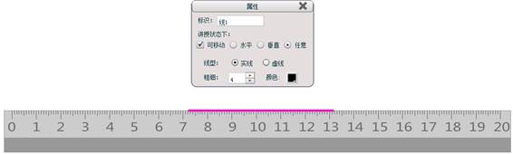 单击“刻度尺”按钮,页面上出现刻度尺,拖拽四个角落的白色矩形框可以对刻度尺的大小进行整体缩放、旋转等。沿着直尺的上边缘可以直接按住鼠标左键进行画线,画好线后单击鼠标右键选择“属性”,在弹出的属性框中对画好的线的线型、粗细、颜色等相关属性进行设置。