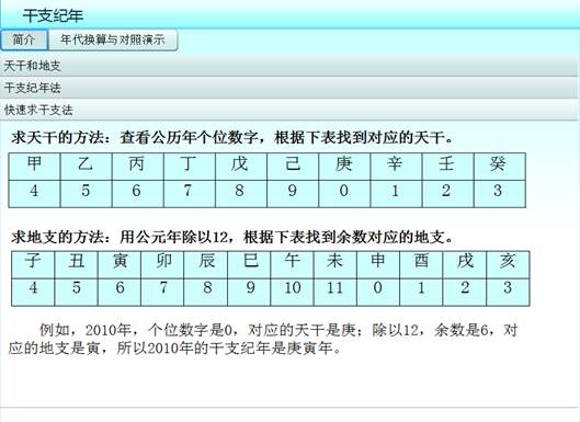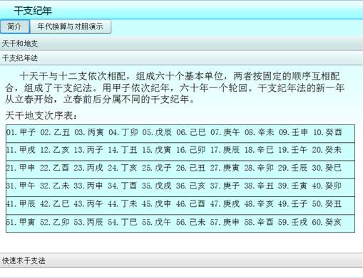 单击“天干地支纪年”辅助工具,主要介绍了天干、地支、天干地支纪年法以及快速算求干支纪年的方法,还提供了公元纪年与干支纪年的对照演示工具,方便用做常识掌握、随时进行纪年转换查询。