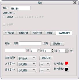 计时器是辅助教师组织课堂活动时计算时间的一种工具,共有五种计时方法,分别是“分别计时”、“以圈计时”、“多项计时”、“倒计时”和“活动倒计时”。可通过“模式”更改记录方式。