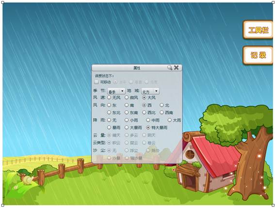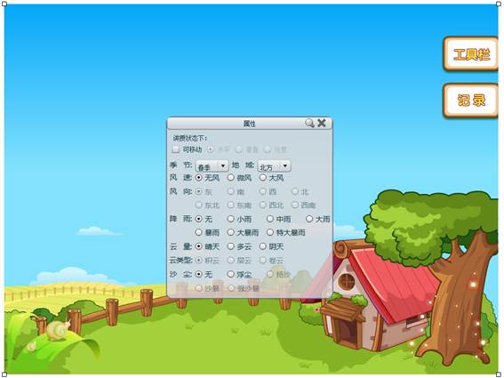 天气为教师和学生提供一个学习常见天气现象和测量、记录天气数据的平台,可选择不同的常见天气现象(包括风、降水、云量等),能够进行天气现象的动态模拟呈现;可选取温度计、雨量计、风向标等工具进行天气数据的测量和记录。