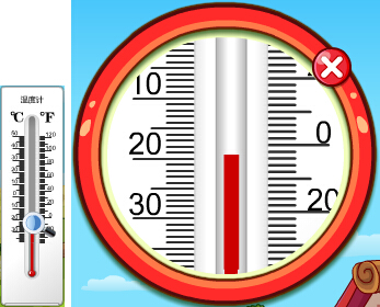 点击温度计,温度计即出现在画面中,当鼠标放到温度计处时将变成放大镜,点击将放大温度计,方便读数和记录。