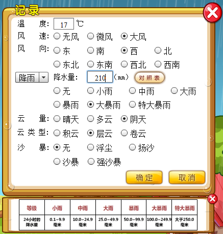 指标中温度、风向和降水量指标是通过工具测量所得,将测量到的数值填到相应的位置。其中降水量指标提供了对照表,可以根据测量到的数值与表格中的数值进行对比,从而获得降雨/降雪的等级信息。其他指标则可以通过直观的观察,将观察到的现象记录下来,点击“确定”,数值和选项将被记录下来。
