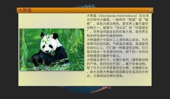 (1)弹出窗口由两部分组成,左侧提供该种动物或植物的图片资料,右侧提供相应的文字说明
