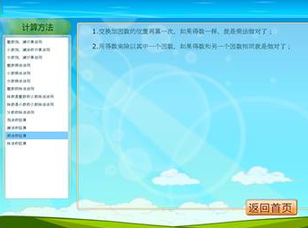 计算方法模块提供了有关四则运算的法则和运算规律,学生可以方便地进行查询和学习。点击左侧列表框中某一运算法则标题,右侧面板上可显示相应的法则讲解。
