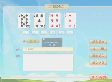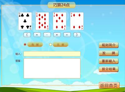 可单击4张扑克牌及“(”、“+”、“-”、“×”、“÷”、“)6个按钮向“输入”对话框中写入回答算式。写入算式后单击“提交结果”按钮查看正误,并可在“答案”框中看到该题所有结果。